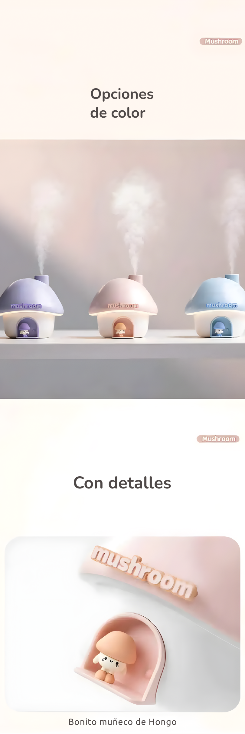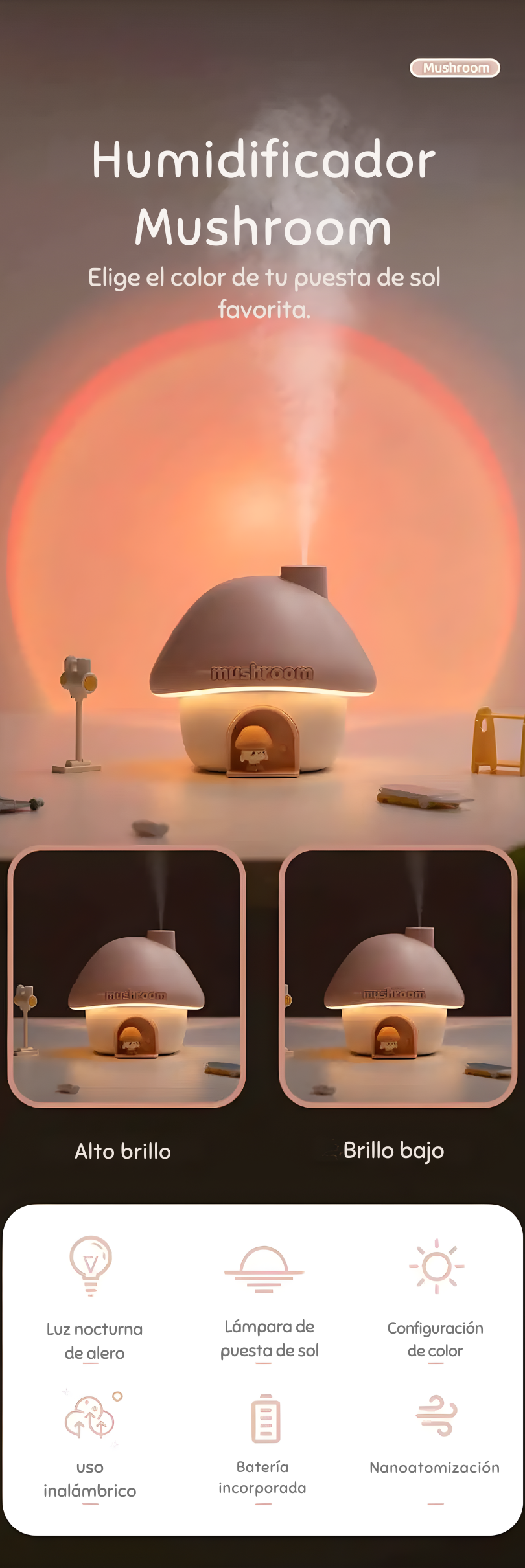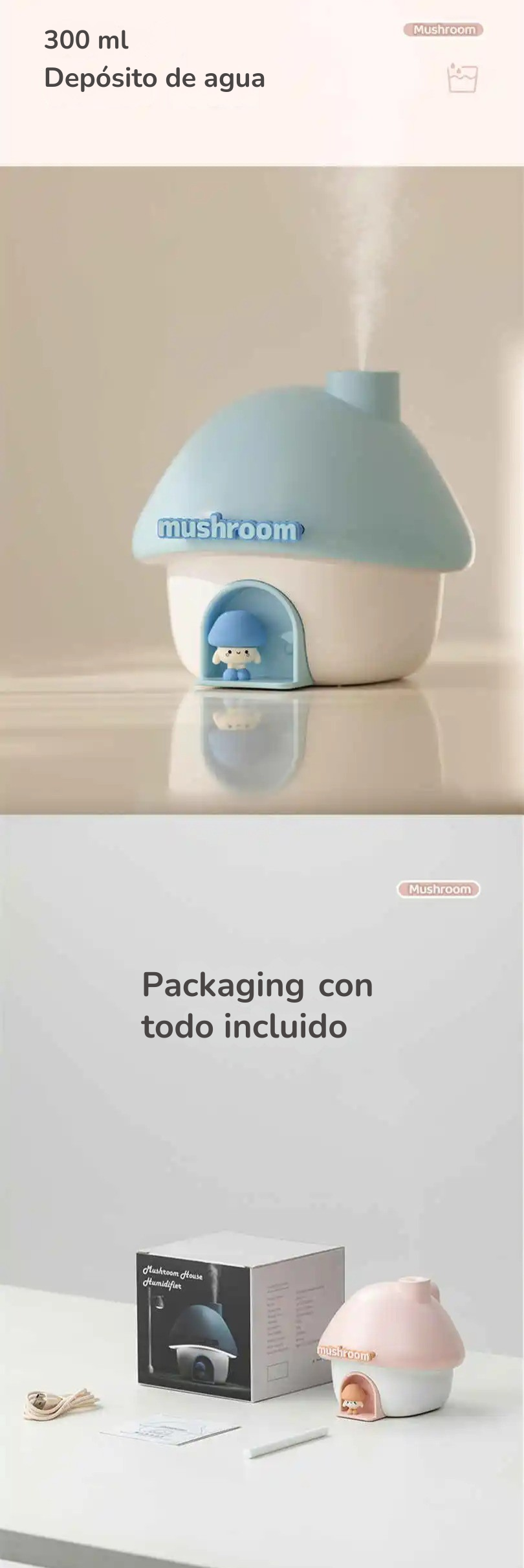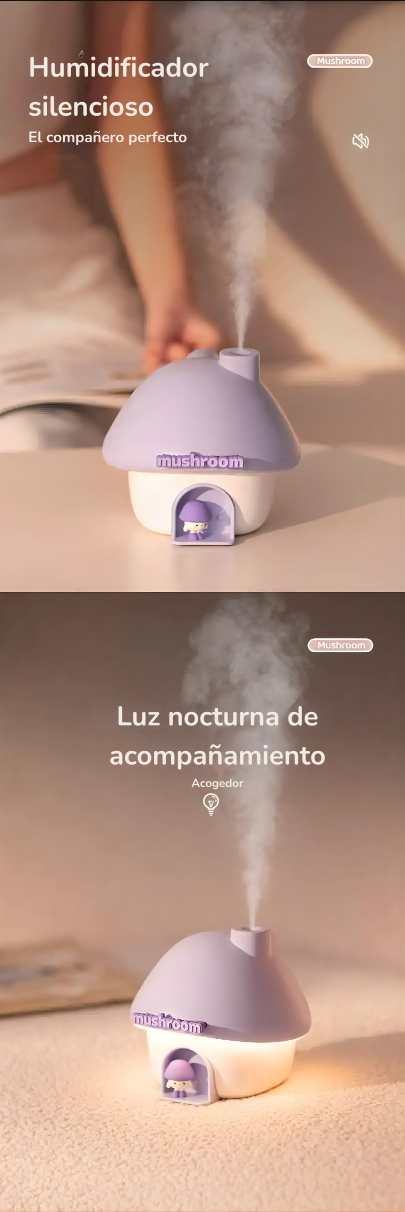 El vapor hidrata el aire, la luz transforma el ambiente y el mini honguito te acompaña en tus momentos de descanso, estudio o autocuidado.
